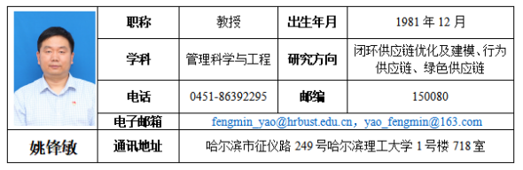 [26] Yan Yingluo, Yao Fengmin*, Sun Jiayi. Manufacturer’s cooperation strategy of closed-loop supply chain considering corporate social responsibility[J]. RAIRO-Operations Research, 2021, 55(6): 3639-3659. (SCI)
