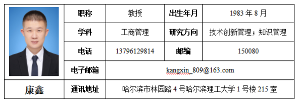 康鑫,博士,博士后,教授,博士生导师,研究方向:技术创新管理;知识管理;知识产权管理。担任黑龙江省管理科学与工程学会常务理事,黑龙江省管理学会理事,中国会计学会会计教育分会理事,黑龙江省知识产权学会理事,黑龙江省知识产权专家,黑龙江省国资委投资咨询专家库入库专家,哈尔滨市人民代表大会常委会地方立法咨询专家咨询库专家,国家哲学社会科学基金评审专家,黑龙江省高端会计人才。在高新技术企业技术创新管理、知识管理以及知识产权管理等方面进行了比较深入的研究,作为项目主持人主持全国哲学社会科学基金2项、中国博士后科学基金1项、黑龙江省哲学社会科学专题重点项目1项、黑龙江省哲学社会科学规划项目2项、黑龙江省自然科学基金1项,山东省重点研发计划(软科学)项目1项,参与完成其他项目多项。以第一作者在《南开管理评论》、《科学学研究》等国内外重要期刊发表学术论文近30篇,出版学术专著及教材4部。