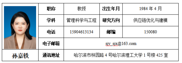孙嘉轶,博士,博士后,教授,博士生导师,研究方向:供应链建模与优化。全国专业学位水平评估专家、国家自然科学基金项目评审专家、教育部学位论文评审专家、中国运筹学会行为运筹与管理分会理事、黑龙江省青年联合会第十三届委员会委员及教育界别委员、黑龙江省县域经济学会副会长、黑龙江省管理科学与工程学会理事、黑龙江省管理学学会理事、中国运筹学会会员、黑龙江省青年科技工作者协会会员、欢迎来公海欢迎来到船701第八届青年五四奖章获得者。担任《中国管理科学》《管理评论》《Transportation Research Part E: Logistics and Transportation Review》《Operations Research Perspectives》《Journal of Cleaner Production》等国内外期刊审稿人。主持国家自然科学基金项目1项、中国博士后基金项目1项、黑龙江省自然科学基金项目1项、黑龙江省社科基金项目1项、黑龙江省博士后科研启动基金1项,作为主要参与者参与国家自然科学基金项目2项、国家社科基金项目4项、教育部人文社科基金项目1项、中央支持地方高校改革发展资金人才培养项目1项等各级科研项目10余项;在《经济科学出版社》《哈尔滨工业大学出版社》出版学术专著2部;在《系统工程理论与实践》《中国管理科学》《系统工程学报》《控制与决策》《RAIRO-Operations Research》等国内外期刊上发表学术论文30余篇;获得黑龙江省社会科学学科优秀科研成果奖三等奖1项;作为主要参与人完成牡丹江市人民政府咨询项目1项。