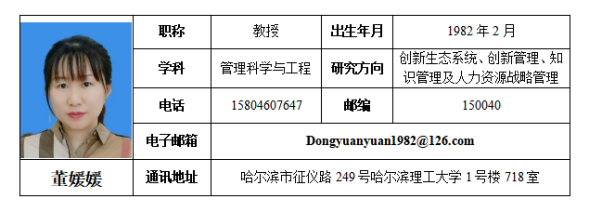 董媛媛,博士,博士后,教授,博士生导师,副经理。研究方向:创新生态系统、创新管理、知识管理及人力资源战略管理。教育部学位论文评审专家,中国技术经济学会技术孵化与创新生态分会理事、黑龙江省管理学学会理事、黑龙江省管理科学与工程学会理事、黑龙江省促进非公经济发展学会常务理事。已主持国家社科基金、教育部人文社科基金项目、黑龙江省自然科学基金、黑龙江省哲学人文社科项目等项目10余项。以第一完成人获省部级科研奖励3项。以第一完成人获得厅局级奖励3项。在SSCI、SCI等国内外重要期刊发表学术论文30余篇。