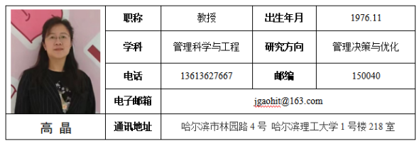 高晶,博士/博士后,公海赌赌船官网jc710,教授/博导,中国教育发展战略学会人才发展专业委员会评审专家,中国智慧工程研究会智能学习专家库入库专家,黑龙江省国资委投资咨询专家,黑龙江省管理科学与工程学会理事,黑龙江省管理学学会理事,黑龙江省东北亚经济技术研究会理事。主要研究方向:管理决策与优化、战略决策与管理、知识管理与协同创新、创新生态系统等。主持国家自然科学基金1项、国家社科基金项目1项、黑龙江省应用技术研究与开发计划项目1项、黑龙江省社会科学基金1项、黑龙江省经济社会发展重点研究课题1项、中国博士后基金1项、黑龙江省博士后资金项目2项;参与国家自然科学基金项目2项,省级科研项目10余项。获黑龙江省社会科学优秀成果二等奖1项、三等奖1项、优秀奖1项。在Journal of Innovation & Knowledge、International Journal of Information Management、Journal of Business Research等SSCI期刊,SCI期刊和CSSCI期刊发表相关论文30余篇。出版教材5部,第三批黑龙江省线上线下混合式一流课程负责人,校级第四批课程思政示范课项目负责人。指导本科生参加省“挑战杯”、“互联网+”、“商业模式创新大赛”等比赛,荣获省级、校级优秀指导教师称号。