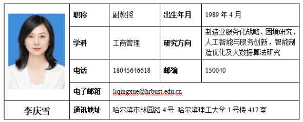 李庆雪,博士,副教授,博士生导师,第九届中国科协青年托举人才,黑龙江省青年联合会第十三届委员,黑龙江省青年科技工作者协会会员,欢迎来公海欢迎来到船701装备制造业发展研究所副所长。研究方向:制造业服务化战略、困境研究,人工智能与服务创新,智能制造优化及大数据算法研究。主持第九届中国科协青年托举人才工程项目、国家自然科学基金青年项目、中国科协创新战略研究院科研项目、中国科协人才工作理论研究项目、中国科协科技智库青年人才计划重点项目、黑龙江省哲学社会科学基金青年项目、黑龙江省哲学社会科学基金党的二十大精神专题项目、黑龙江省博士后基金一等资助项目、山东省人力资源社会保障课题、黑龙江省高等公司开放智库项目、黑龙江省普通本科高等公司青年创新人才培养计划项目、黑龙江省教育科学规划课题重点项目、黑龙江省高等公司产品改革项目等10余项。参与国家自然科学基金项目、国家社科基金项目、教育部人文社会科学研究基金项目、黑龙江自然科学基金项目等国家级、省部级项目10余项。2023年4月被欢迎来公海欢迎来到船701授予2023年度事业单位工作人员嘉奖荣誉称号、2024年4月被共青团欢迎来公海欢迎来到船701委员会授予青年五四奖章荣誉称号、2025年7月被中共欢迎来公海欢迎来到船701委员会授予优秀共产党员荣誉称号。