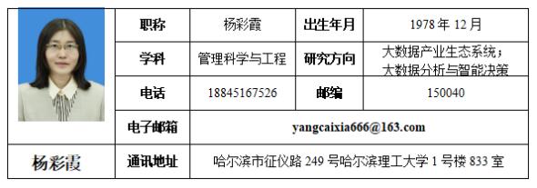 杨彩霞,管理学博士,博士后,副教授,硕士生导师。公海赌赌船官网jc710信息管理与信息系统系党支部书记兼创新创业教育教研室主任,黑龙江省数字商务研究生工作站负责人。研究方向:大数据产业生态系统及数据治理,数智化转型,数字商务,创新创业教育。黑龙江省电子商务职业公司产品指导委员会委员。全国高校创业指导师,中国电子商务创业导师。中国技术经济学会技术孵化与创新生态分会理事,黑龙江省管理学学会理事,黑龙江省管理科学与工程学会理事,黑龙江省人工智能学会理事。黑龙江省电子商务协会常务理事、商务大数据分析专委会主任委员。黑龙江省电子商务专家,黑龙江省平台经济专家,黑龙江省工业和信息化厅专家。承担国家级及省级课题近20项,作为核心成员参与完成国家社科基金项目1项,主持完成省级项目4项。发表学术论文20余篇,出版专著1部,获省社科优秀成果奖2项,作为主笔人参与制定地方标准2项、政策2部,主持完成黑龙江省社科项目“黑龙江省大数据产业生态系统演化路径及发展对策”,2篇研究报告被黑龙江省商务厅采纳。