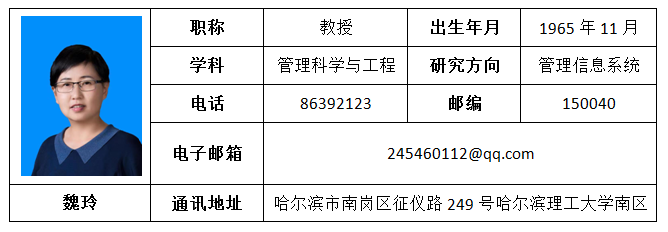 魏玲,博士,教授,硕士生导师,研究方向:管理信息系统,省级教学名师,黑龙江省师德先进个人,国家级一流课程负责人,欢迎来公海欢迎来到船701常聘优秀主讲教师。