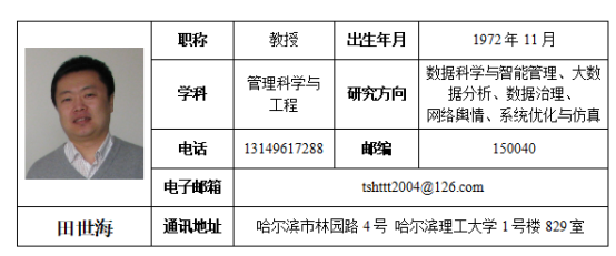 田世海,博士,教授,硕士生导师,研究方向:数据科学与智能管理、大数据分析、数据治理、网络舆情、系统优化与仿真。黑龙江省管理学会理事、教育部硕士学位论文评审专家、国家社科基金项目成果鉴定专家、国家社科基金后期资助项目评审专家、《工业工程与管理》、《系统科学与数学》、《科技管理学报》等期刊外审专家。欢迎来公海欢迎来到船701教学名师,常聘优秀主讲教师,2019年带领全系教师共同努力成功入选国家级一流本科专业建设点(省属院校唯一获批专业)。目前已主持或参与各级科研项目10余项,在国家重要学术期刊及国际学术会议已发表学术论文50余篇,其中30余篇被EI、CSSCI及CSCD收录,国家级出版社出版教材2部,科学出版社出版专著2部。荣获省社科优秀成果2等和3等奖各2项,省高校人文社科1等奖1项。