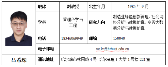 吕希琛,博士(后),副教授,硕士生导师,公海赌赌船官网jc710信息管理与信息系统专业系主任。主持省部级以上科研项目7项:包括教育部人文社科基金项目1项、中国博士后面上资助项目1项、黑龙江省哲学社会科学规划项目2项、黑龙江省自然科学基金项目1项、黑龙江省经济社会发展重点课题1项、山东省重点研发(软科学)计划项目1项;作为主要参与人参与完成国家自然科学基金项目、黑龙江省自然科学基金项目、黑龙江省哲学社会科学基金项目等多项;出版高水平学术专著2部;在国内外经济与管理类重要学术期刊发表学术论文10余篇。