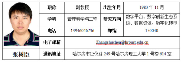 张树臣,博士,副教授,硕士生导师。研究方向:数字平台、数字创新生态系统、数据资源与数字化转型。中国技术经济学会技术孵化与创新生态分会理事、黑龙江省管理科学与工程学会理事、黑龙江省管理学学会理事,省市自然基金项目函评专家,教育部学位中心学位论文通讯评议专家。主持教育部人文社科基金1项,黑龙江省青年科学基金1项、黑龙江省哲学社会科学研究规划项目1项、黑龙江省高校青年创新人才培养计划项目1项、黑龙江省优秀青年教师基础研究支持计划哲学社科重点项目1项,黑龙江省博士后基金项目1项。参与并完成黑龙江省公司产品研究项目重点项目1项,参加国家自然料学基金面上项目5项、黑龙江省自然科学基金2项、黑龙江省社科基金2项。在国家自然基金委重要期刊及CSSCI、SSCI学术期刊上共发表论文30余篇,出版学术专著两部,获得黑龙江省社会科学成果三等奖2项,获得黑龙江省社会科学学科优秀科研成果三等奖1项。