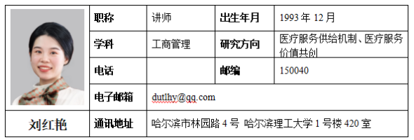 刘红艳,博士,讲师,硕士生导师,研究方向:医疗服务供给机制、医疗服务价值共创。担任Journal of Public Administration Research and Theory、Journal of Chinese Governance、International Review of Administrative Sciences等国际期刊审稿人。主持教育部青年项目1项,参与国家自然科学基金重点项目、面上项目和财政部项目等6项。参与撰写研究报告1份;在国内外经济与管理类重要学术期刊发表学术论文5篇。