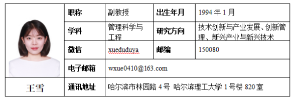 王雪,博士,副教授,硕士生导师,黑龙江省管理科学与工程学会理事。研究方向:技术创新与产业发展、创新管理、新兴产业与新兴技术。主持国家社会科学基金青年项目1项,厅局级项目1项,参与多项国家级、省部级项目;以独作在国家级出版社出版学术专著1部;以第一作者或通讯作者在国内外经济与管理类重要学术期刊发表学术论文7篇。
