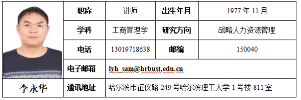 李永华,博士,讲师,硕士生导师,研究方向:战略人力资源管理。主持完成哈尔滨市科技攻关计划项目1项,参与完成国家社会科学基金1项、黑龙江省自然科学基金2项,参与黑龙江省社会科学基金、自然基金各1项。发表SCI论文、EI期刊论文各1篇,作为第三完成人获得黑龙江省高校人文社会科学研究优秀成果奖一等奖。