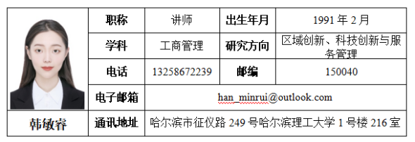 韩敏睿,博士,讲师,硕士生导师,研究方向:区域创新、科技创新与服务管理。以第一作者或通信作者在国内外经济与管理类重要学术期刊发表学术论文多篇,“正大杯”大员工市场调查与分析大赛省级一等奖。