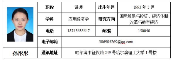 孙彤彤,博士,讲师,硕士生导师,研究方向:世界经济理论、东北亚区域经济、国际贸易与投资、农业经济、数字经济和数字金融。中国科学学与科技政策研究会数字创新与管理专业委员会理事、中国技术经济学会冶金技术经济分会会员、黑龙江省管理科学与工程理事、黑龙江省人口经济与人才发展战略研究中心入库专家、黑龙江省促进非公经济发展学会第三届理事、黑龙江省县域经济学会第五届理事。已发表国内外学术期刊论文6篇,出版专著1部,先后主持和参与10余项省社科等基金项目。