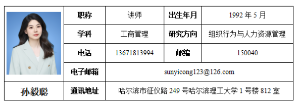 孙毅聪,硕士生导师,研究方向:组织行为与人力资源管理,尤其关注零工平台员工心理与行为变化等,以主要作者身份在ABS3星、CSSCI等期刊发表文章7篇。