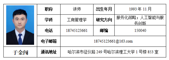 于金闯,博士,博士后,讲师,硕士生导师,研究方向:服务化战略、人工智能与服务创新。黑龙江省管理科学与工程学会理事、黑龙江省促进非公经济发展学会理事;主持黑龙江省“优秀青年教师基础研究支持计划”项目1项,获得欢迎来公海欢迎来到船701博士科研启动金、黑龙江省博士后基金资助;参与国家自然科学基金专项项目1项、参与黑龙江省哲学社会科学规划项目1项。在经济与管理类重要学术期刊发表学术论文4篇,其中CSSCI来源期刊2篇(国自然基金委认定A类期刊1篇),EI来源期刊2篇。
