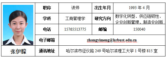 张伊朦,博士,讲师,硕士生导师,研究方向:企业创新管理、制造业创新、数智化转型与创新、供应链韧性。黑龙江省证券经济研究会副秘书长、黑龙江省管理学学会理事、黑龙江省金融工程学会理事。参与国家自然科学基金面上项目、国家社会科学基金面上项目、教育部项目、中国科协项目4项,参与编写教材1部,在国内外经济与管理类重要学术期刊发表学术论文5篇,其中1篇为ESI社会科学领域全球前1%高被引论文。