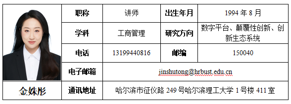 金姝彤,博士,讲师,硕士生导师,研究方向:数字平台、颠覆性创新、创新生态系统。担任黑龙江省县域经济学会理事。在SCI、SSCI、CSSCI收录期刊发表论文十余篇,其中5篇发表在国家自然科学基金委管理学部重要期刊上。作为主要参与人,完成1项国家社科基金项目,并获得了优秀的结题等级;7项省部级项目,包括辽宁省社科重大项目等,和沈阳市科协创新智库研究课题1项市级项目。2021年5月16日,在《科学学研究》期刊上发表的《全球价值链下的企业颠覆性创新生态系统研究》一文,获得辽宁省政协副主席赵延庆同志的批示。