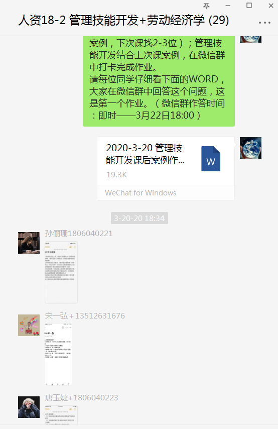 为了保证课前、课中和课后员工学习的连贯性,王卫老师所留的课后作业往往具有挑战性和激励性。例如,案例观点作业限定时间通过微信群拍照上传,后面上传的员工需要仔细阅读前面员工的观点,补充作答,巩固课堂内容并督促员工课外自主学习。在线教学虽一定程度上改变了传统教学方式,同时也对教师的教学带来了一定的难度,但对于王卫老师而言,“以员工为中心、以成果为导向”的教学理念并未改变,多手段多平台协同推进更加强化了在线授课效果。