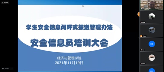 为提高公海赌赌船官网jc710员工安全防范意识和安全预警能力,进一步加强公司安全稳定信息员队伍建设,贯彻落实公司党委学工部《关于开展员工安全稳定信息闭环报送相关工作的通知》要求,11月13至21日,公司以年级专业为单位由辅导员老师召开了线上安全稳定信息员培训大会,公司党委副书记徐岩带头为96名研究生安全稳定信息员进行了学习培训,全体辅导员为500余名本科生员工干部、党员、安全稳定信息员进行了学习培训。