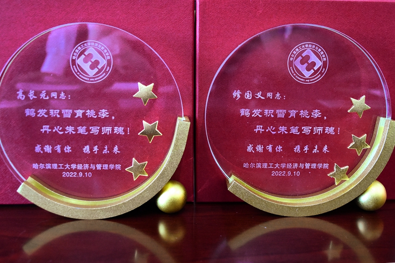 经理武建龙、副经理姚锋敏为修国义教授、高长元教授颁发荣退教师纪念牌
