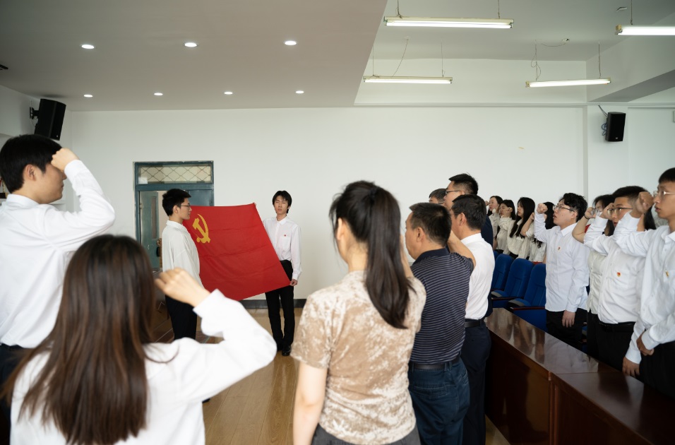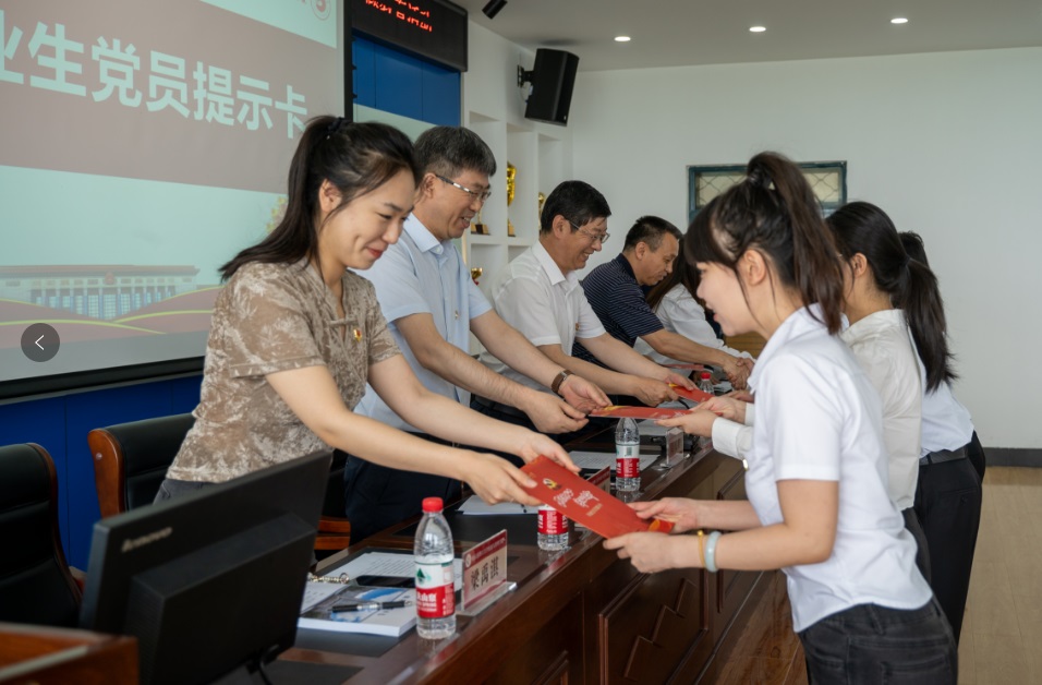 接下来,毕业生党员代表曲昀佳宣读了个人入党志愿书,分享了自己的入党谈话经历。通过重温入党志愿书和入党谈话,全体毕业生党员表示,离开公司后会一如既往地坚定理想信念,高举信仰旗帜,常思入党初心,做到初心不改、践诺一生,无愧于共产党员的光荣称号。随后,在毕业生党员代表吴晓鹏的领誓下,现场全体党员面向党旗,举起右手,紧握成拳,庄严宣誓。重温誓词结束后,公司领导及毕业班辅导员老师为毕业生党员代表胡中冠、张玲宵、马宏达、张辉、田韵新、李岳彤,发放“党员提示卡”。一张张鲜红的“党员提示卡”承载了公司对毕业生党员的殷切嘱托,希望他们严格要求自己、做好表率,让青春之花在祖国大地上绚丽绽放。