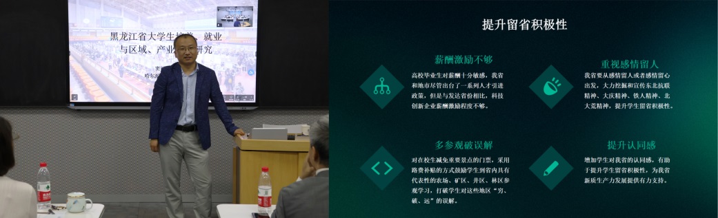 哈尔滨商业大学窦以鑫副教授以“黑龙江省老员工培养、就业与区域、产业需求研究”为题展开课题研究报告,他对当前黑龙江省高等教育现状表达了担忧,在分析了当前黑龙江省高等教育与就业存在的问题后,针对当前黑龙江省新质生产力发展与就业结构、人才培养、团队建设等问题进行了深入分析,他认为当前黑龙江省财政紧张的情况下,应对产业培育、人才建设进行慎重的再思考,并结合自身工作提出教育改革创新的构想。