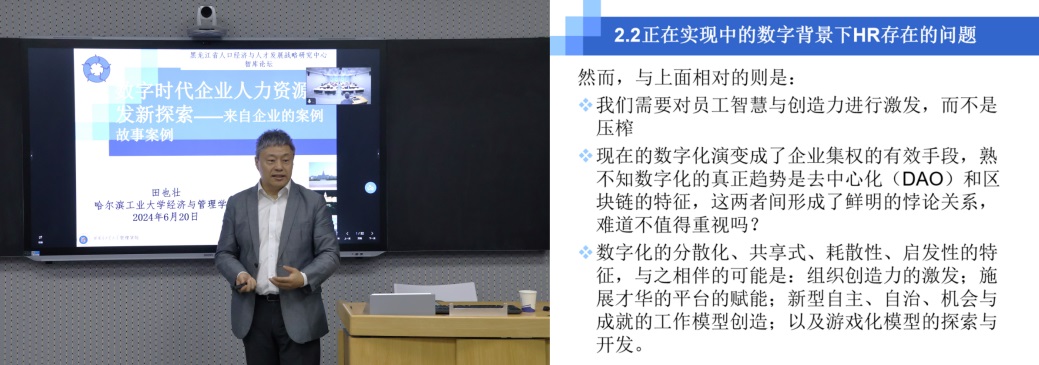 学术报告环节,哈尔滨工业大学田也壮教授以“数字时代企业人力资源开发新探索——来自企业的案例故事案例”为题展开学术报告,主要包括分析当前黑龙江省产业孵化成果的现状,数字化时代下企业舆情管理、传统生产力落后所面临的问题,详细介绍了马春野总经理建立的CMVP环境机制,并给予了高度的评价。