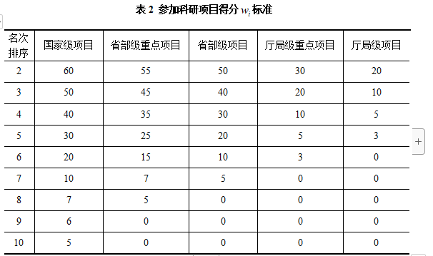 科研项目分为国家级、省部级重点、省部级、厅局级重点、厅局级五个等级。教育部人文社会科学研究项目认定为省部级重点。其它项目应由评审委员会参照上述划分标准进行归类。参加科研项目得分标准如表2所示。