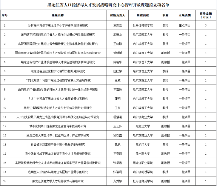 根据《黑龙江省高等公司智库开放课题实施方案》(黑教规〔2022〕19 号)《黑龙江省高等公司智库开放课题招标公告》的要求,黑龙江省人口经济与人才发展战略研究中心严格按照要求,组织了课题申报、形式审查、专家评审、公司审核。现将拟推荐立项的开放课题进行公示。
