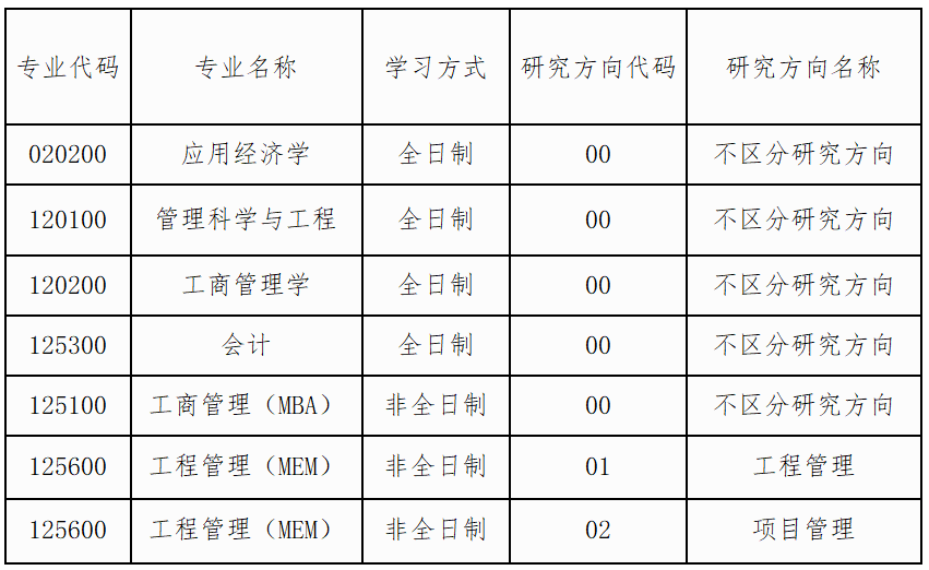 公司应用经济学(学科代码020200)、管理科学与工程(学科代码120100)、工商管理学(学科代码120200)、会计(专业代码125300)、非全日制工商管理专业学位(专业代码125100)、非全日制工程管理专业学位(专业代码125600)接收调剂生。