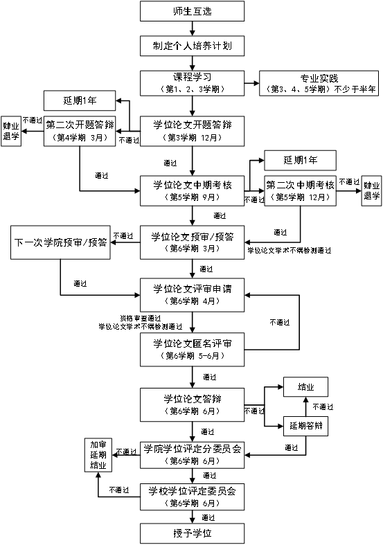 注:各环节的具体要求参见相关规定执行。其中,不涉及预审和预答环节的专业学位论文直接跳过此环节。