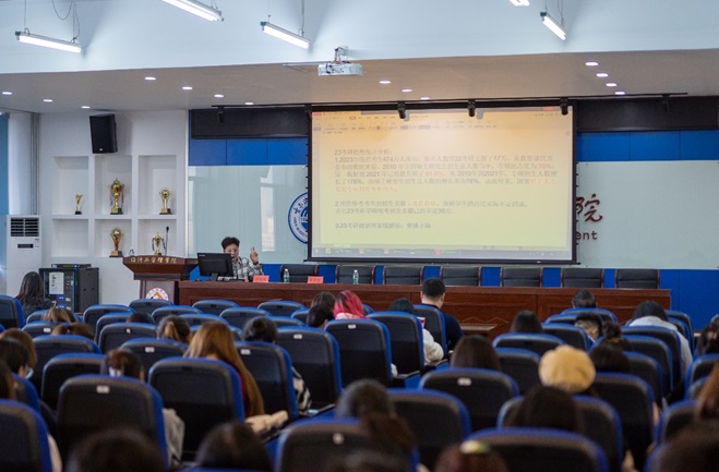 之后,高安彤老师对近年研究生考试趋势进行了统计分析,并带领同学们了解了学位硕士和专业硕士的异同点、考研英语与四六级考试的区别以及择校时的注意事项。他详细介绍了研究生考试的科目以及题型分数的分布,并强调了考研是选拔性考试的重要性。同时,他还为同学们准备了近年研究生考试国家分数线等相关材料进行参考,帮助同学们在考研中能做出最适合自己的选择。