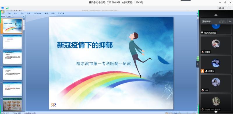 在心理活动月期间,公司邀请了哈尔滨市第一专科医院尼斌医生,针对疫情期间老员工的心理健康进行专题讲座。经管公司各年级、各班心理委员参加了讲座。同学们认为这个讲座内容紧贴老员工实际学习和生活情况,对进一步做好班级心理健康工作很有启发,收益匪浅。