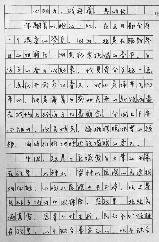 公司广泛宣传、积极鼓励全院同学积极参加公司举办的“老员工原创心理征文活动”。同学们在征文中表达了对医护工作者的崇高敬意,表达了对生命健康的珍视,表达了对党和政府高度信任,同时也表达了对公司和老师的感谢和思念之情。