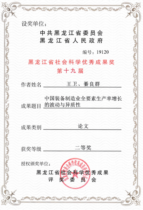 随着研究的不断积累,他以第一作者在《数量经济技术经济研究》、《山西财经大学学报》等CSSCI期刊陆续发表多篇学术论文,在经济管理出版社、经济科学出版社出版独著2部,获黑龙江省社会科学优秀成果二等奖1项。2021年,历经了4年的反复修改与坚持申请,他主持申报题为《数字经济时代中国全要素生产率增长的实现路径与政策体系研究》的课题获批了2021年度国家社科基金青年项目。
