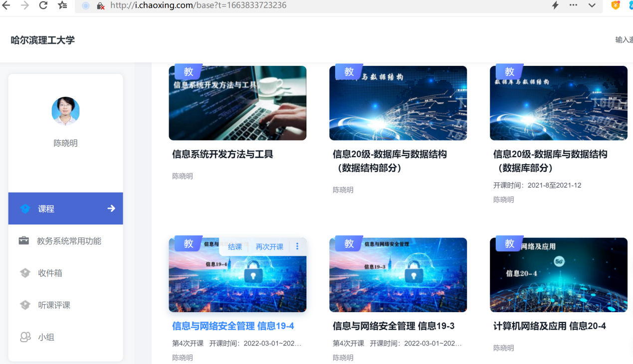陈晓明主讲数据库与数据结构,信息系统开发,计算机网络应用、网络与信息安全、ERP原理及应用等多门课程,教学相长,在教学中将所学知识融会贯通。为提升教学能力和水平,2019年申请国家公派访问学者项目,到瑞尔森访学一年,她还积极参加哈理工第六届青年教师教学竞赛,并获得文科组三等奖。积极参与各类省级校级教学教改项目的研究工作,是国家一流本科课程《ERP原理与应用》课程组的主要成员。