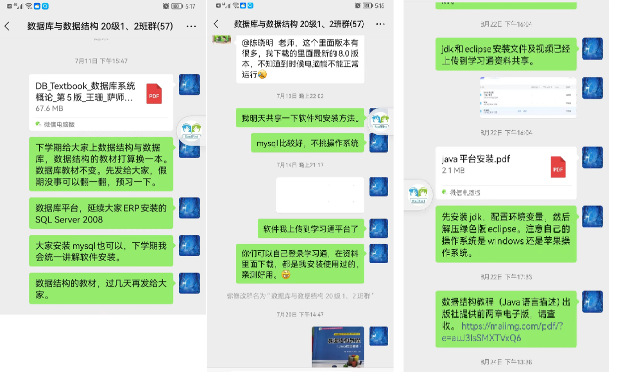 创建微信学习交流群,方便员工和教师课余时间交流。在寒暑假期间发布下学期授课教材,鼓励同学们在暑假预学课程;共享授课软件、软件安装视频,让员工假期空闲时间尝试软件安装;刚开课员工还没有收到公司邮寄的课本,课前需要根据课程内容准备相关教学材料,将电子版课件、电子书、参考文献等提前上传至“微信群”和学习通网盘,方便同学们下载学习资料;在每节课前,说明下节课的教学内容并把课件发布到微信群,提醒员工做好课前预习工作。