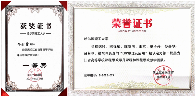 充分发挥专业自身特色和优势,贯彻落实“三全育人”教育理念,坚持“德智并重、德业融合”,挖掘专业课程中蕴含的文化基因和价值范式,在“润物细无声”的知识学习中融入理想信念层面的精神指引。以课程建设为主战场、课堂建设为主渠道,积极开展党建引领、课程思政、创业实训、文化融合等特色思想政治教育工作,引导员工参加丰富多彩的校园文化活动,激发员工爱党、爱国、爱校的情怀。通过通识课、专业前沿课程、专业创新实践课以及系列主题教育活动和第二课堂实践,激发员工勤于实践、追求卓越的激情。2021年,杨彩霞副教授荣获“黑龙江省首届高等公司课程思政教学竞赛”研究生赛道一等奖。2022年魏玲教授等负责的《ERP原理及应用》被认定为“黑龙江省高等公司课程思政示范课程和课程思政教学团队”。