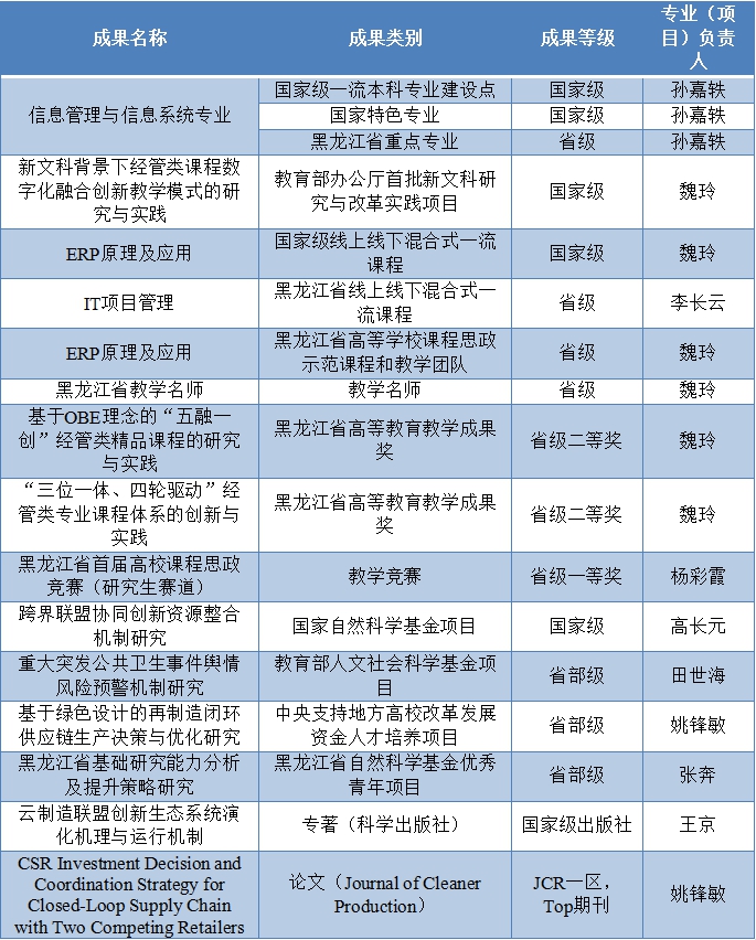 编者按:信息管理与信息系统专业始建于1998年,2006年被评为“黑龙江省省级重点专业”,2007年被评为“国家特色专业”,2012年再次获批为“黑龙江省省级重点专业”,2020年入选首批国家级一流本科专业建设点,为黑龙江省属院校唯一首批入选专业。所属学科“管理科学与工程”学科在教育部第四轮学科评估中取得B等级(前20%-30%),入选黑龙江省高水平大学特色优势学科、黑龙江省国内一流建设学科。