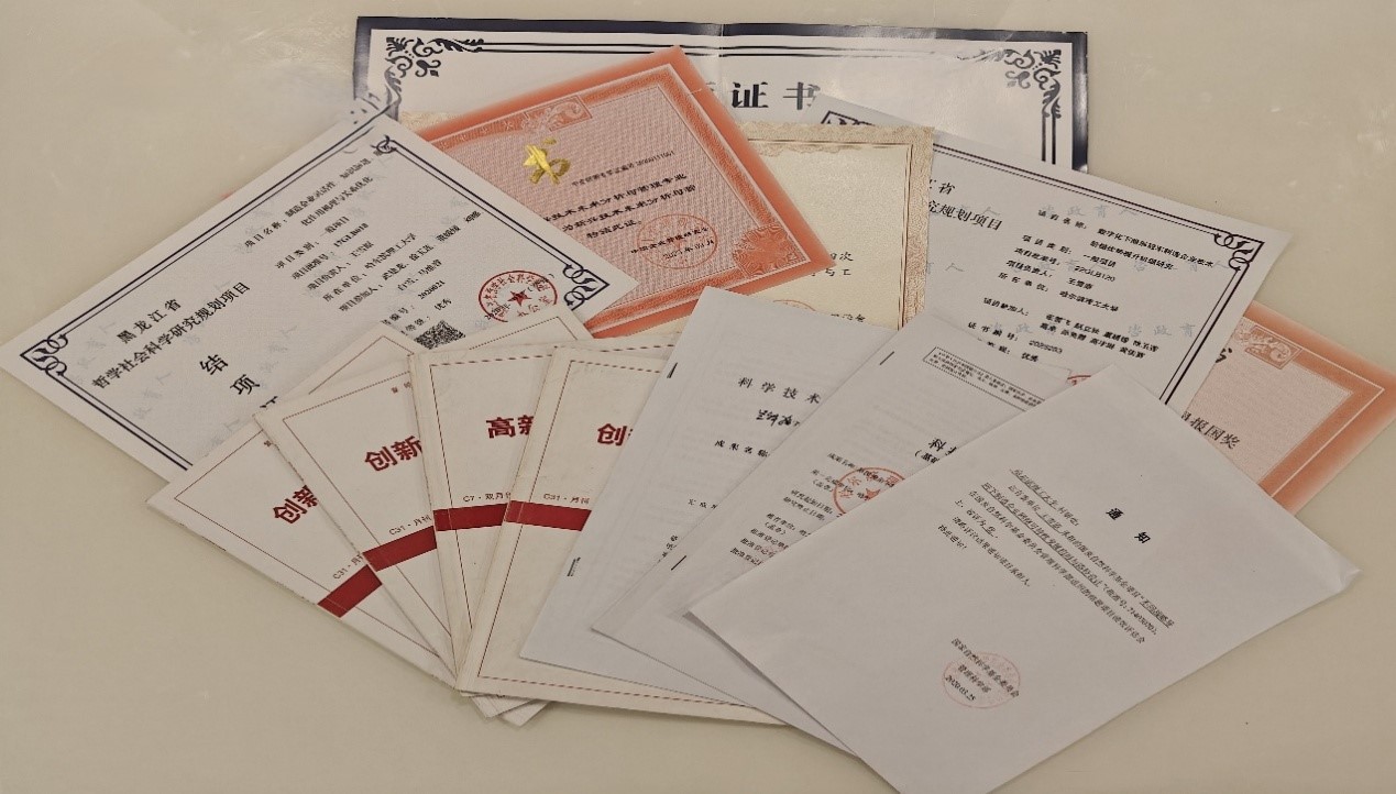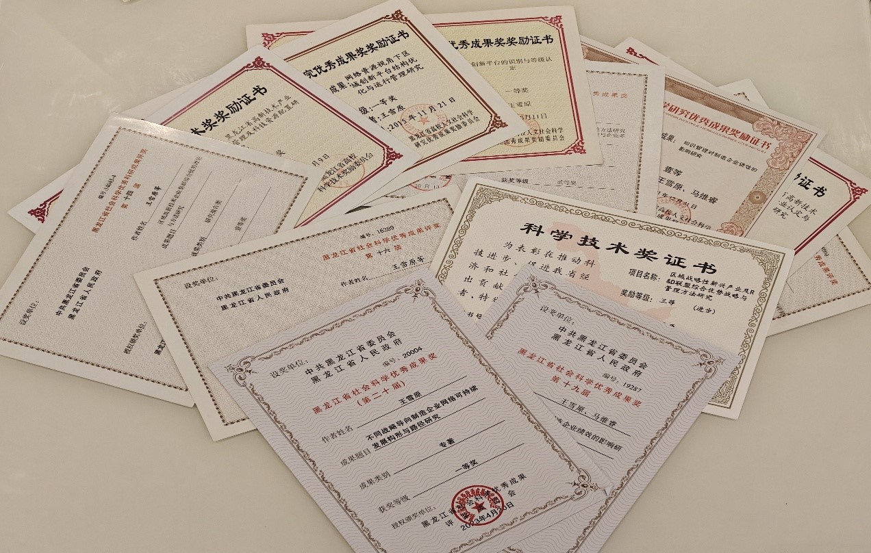 凭借扎实的研究成果,获省部级奖励10余项,包括黑龙江省社会科学优秀成果一等奖、黑龙江省社会科学优秀成果二等奖、黑龙江省科技进步二等奖、黑龙江省科技进步三等奖、教育部高等公司科学研究优秀成果奖三等奖等省部级奖励。
