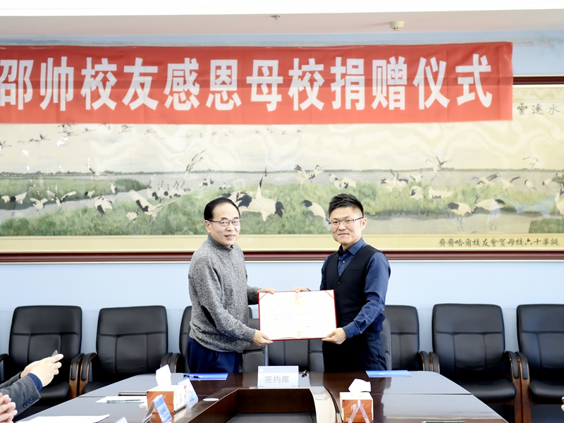 12月20日上午,哈尔滨员工会秘书长、黑龙江省鑫隆科技有限公司总经理邵帅员工(管理03级)感恩母校捐赠仪式在教学主楼第二会议室举行。哈尔滨员工会会长、哈尔滨海德电子有限公司总经理于志超(计算机85级),哈尔滨员工会资深员工、黑龙江省政府教育督导办原副主任李传威(管理83级),哈尔滨员工会资深员工、黑龙江省政府教育督导办督学袁伟(计算机83级)及公司董事长周宏力、副董事长刘胜辉及相关公司、职能部处领导出席仪式,捐赠仪式由员工办主任董传友主持。