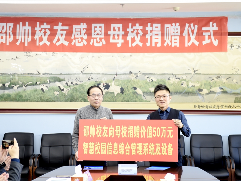 邵帅员工系公司工商管理专业2007届毕业生,先后担任大庆市伟业电脑科技有限公司总经理,黑龙江省鑫隆科技有限公司总经理,现为中国声光视讯工程商联盟黑龙江副秘书长、中国演艺设备技术协会会员、中国青年企业家协会会员。本次捐赠的智慧校园信息综合管理系统及设备,可实现全校LED屏、电子展板和智能班牌等设备的一体化管理,可与录播系统及虚拟校园电视台相连,动态展示教学课程、校园招聘等信息,为更好地推动公司智慧校园建设奠定了良好的基础。